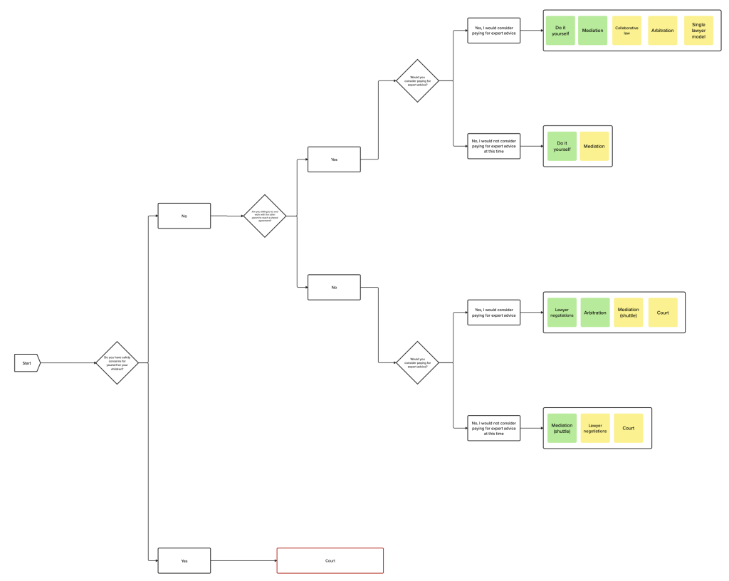 We realised we needed to go through a process of reduction, and from SME interviews, we found two variables that can be used to provide an initial list of suitable resolution options – the level of interaction between parents (i.e. their willingness to work together), and financial means.