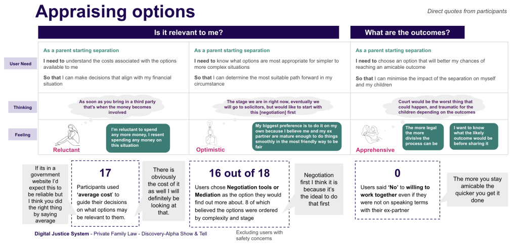 We conducted a Discovery-Alpha to research and design a guided pathway service aimed at helping parents navigate the complex process of separation resolution. Building on evidence from previous discovery work, we aimed to address the challenges parents face when making child and financial arrangements.